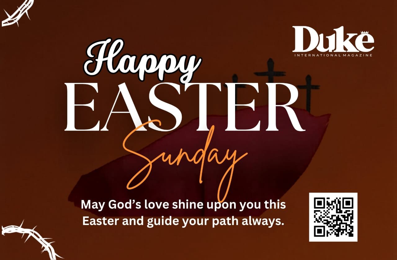 The message, presented with elegant simplicity alongside a joyful Easter design, captures the essence of the occasion—hope, divine love and the promise of brighter days ahead. As families and communities come together to celebrate, Duke International Magazine takes this opportunity to express gratitude for the continued trust and engagement of its audience.